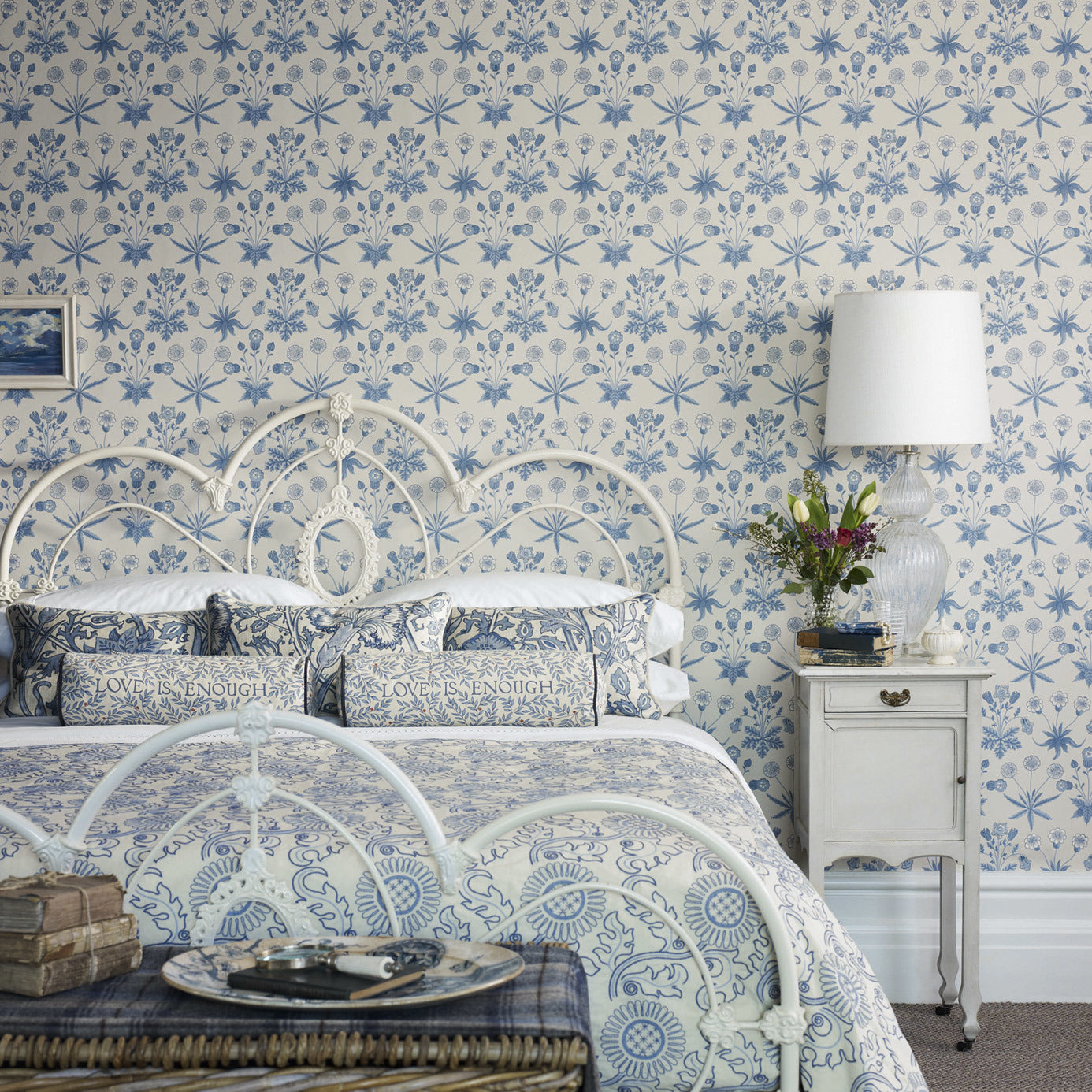 Daisy was the first wallpaper to be produced by Morris & Co. and was inspired by medieval illustrations. Morris created this design after embroidering daisy motifs on wallhangings for the Red House. This version retains the naively drawn daisies and ranunculuses of the wallpaper but has been simplified by the removal of background tufts of grass and is available in the original colourways.