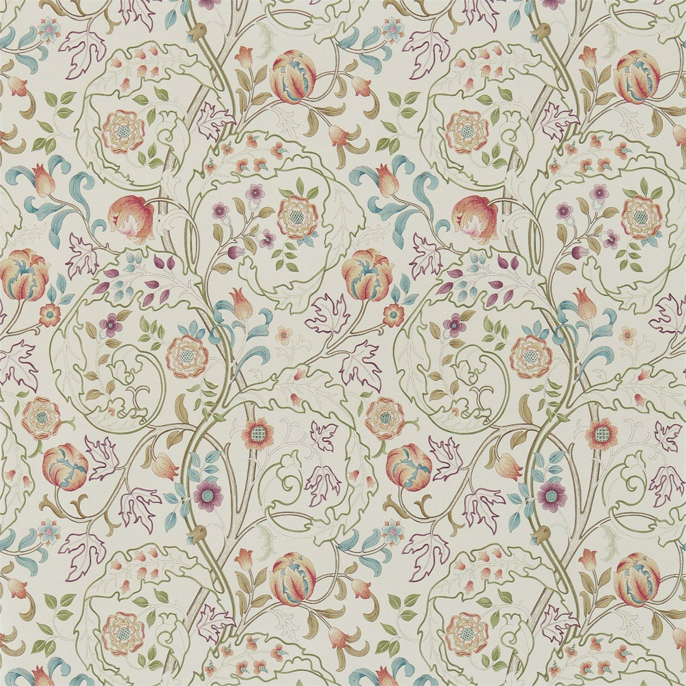 Scrolling acanthus leaves and flowers adorn this wallpaper, adapted from an embroidery designed in the 1890s by J. H. Dearle. This wallpaper is available in joyful colourways including a shimmering pale Silk Blue version printed in mica inks.