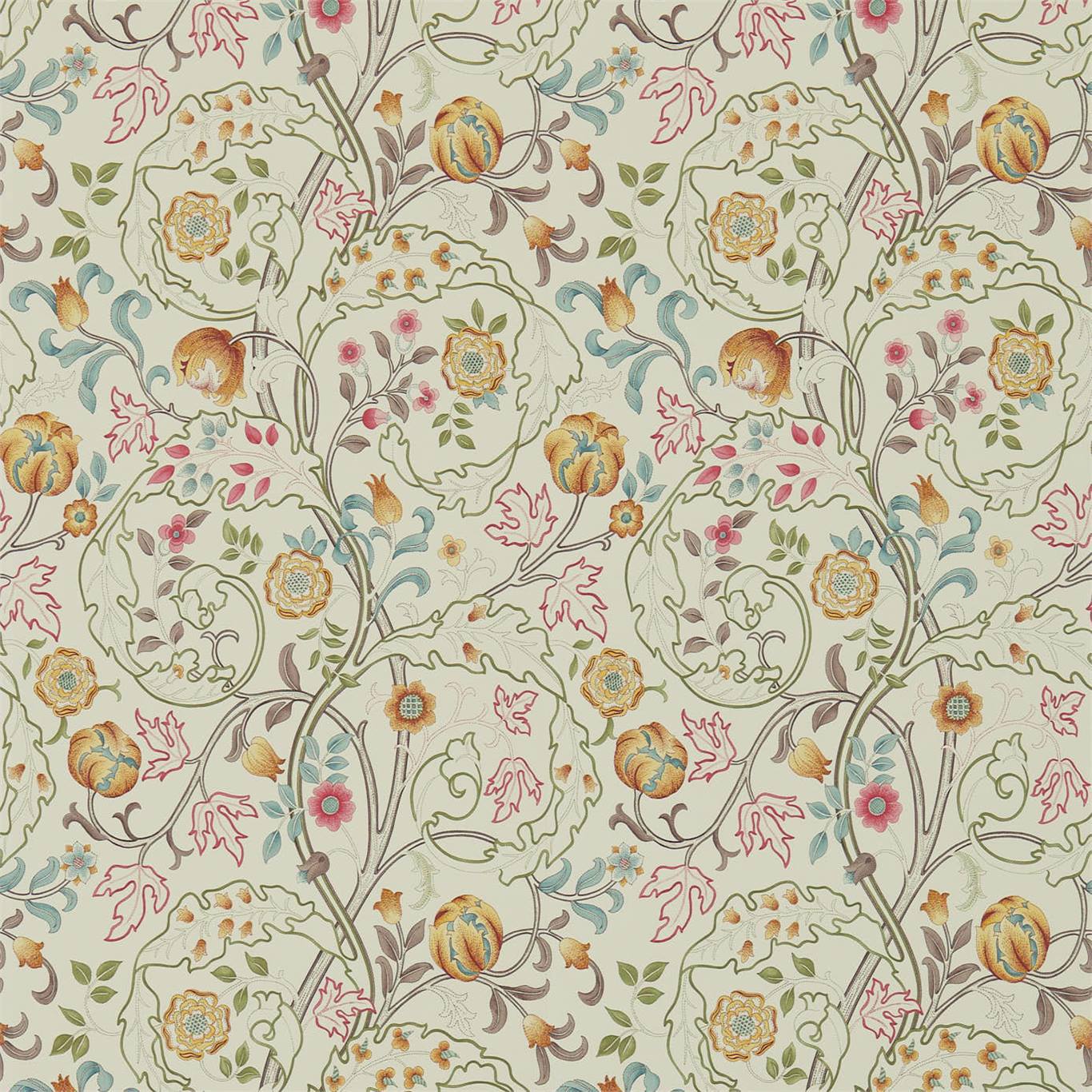 Scrolling acanthus leaves and flowers adorn this wallpaper, adapted from an embroidery designed in the 1890s by J. H. Dearle. This wallpaper is available in joyful colourways including a shimmering pale Silk Blue version printed in mica inks.