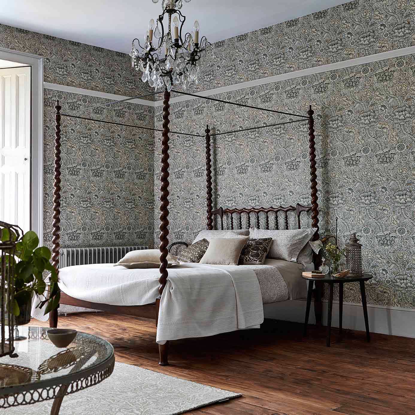 First produced in 1884, this opulent wallpaper design features a striped meandering diagonal branch from which flowers emanate. The original would have needed 32 blocks to print it. Todays version is available in a stunning array of colourways including an icy stone version, perfect for all walls of the room.