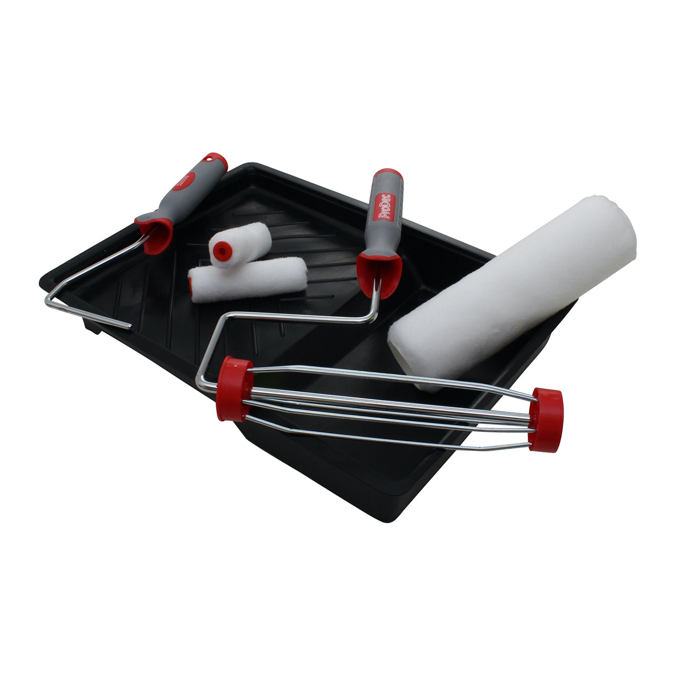 Decorate smooth and semi-smooth surfaces with Prodec's 9" & 4" Decorating Kit. Fused Fibre Technology ensures exceptional loading and release for a trade-quality, ultra-smooth finish. The set includes 1x 9" Ice Fusion roller sleeve, 2x 4” Ice Fusion roller sleeves, 1x 9” soft grip roller frame, 1x mini soft grip roller frame and a rugged 9” roller tray made from 100% recycled plastic. The sleeves are 12mm medium pile sleeves with increased strength and lint-free fabric. Suitable for water-based emulsions and satin paints.