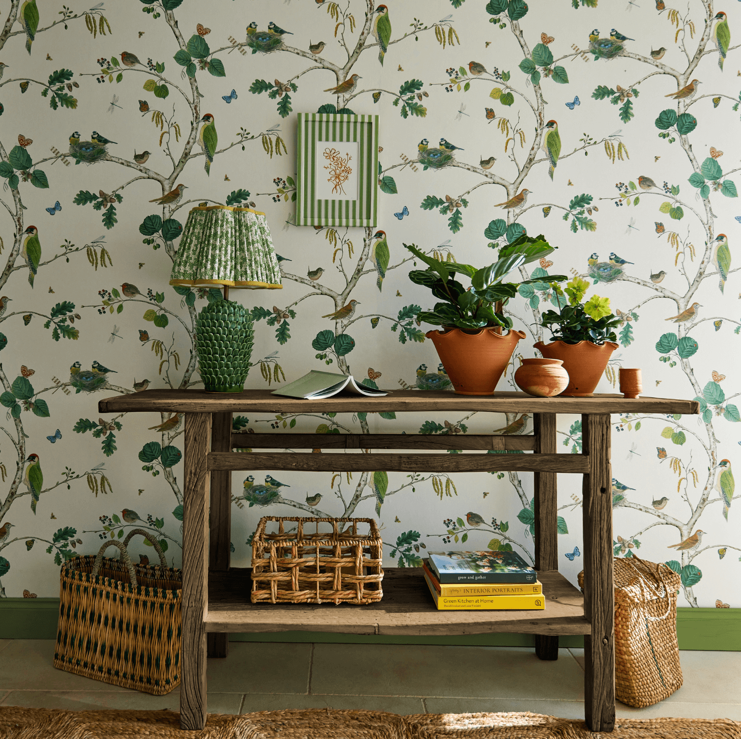 This realistic depiction of our favourite British birds was inspired by an 18th century painting of plants and animals. A green woodpecker, wren, robin and thrush perch alongside a pair of nesting blue tits, making their home in a modern tree of life. To complete the scene, butterflies, insects, ladybirds and various woodland berries adorn the tree. The exquisitely detailed design is painted in fine watercolour.