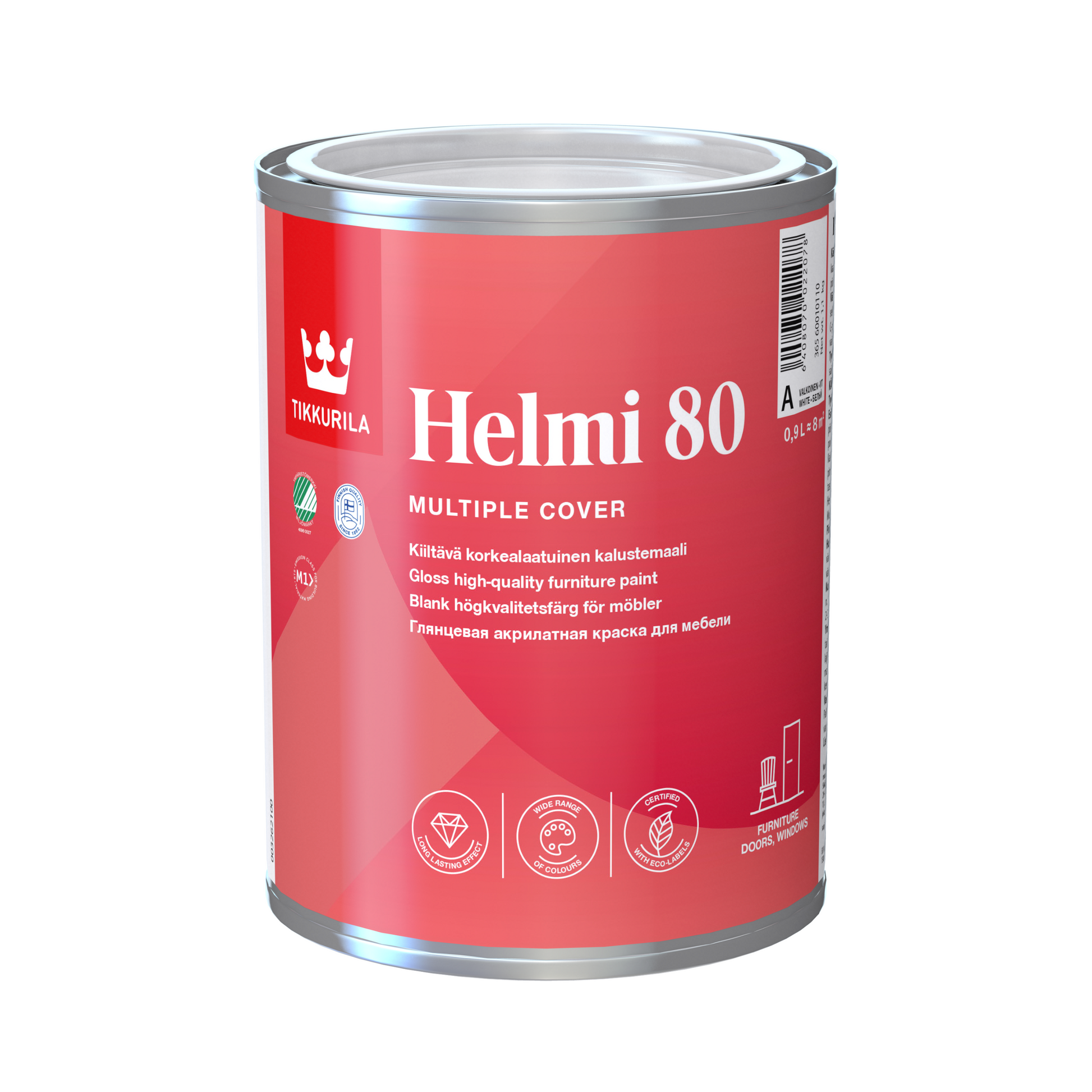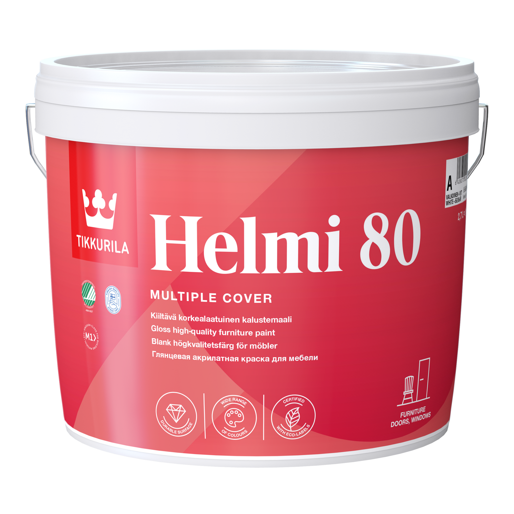 Ideal for use on surfaces such as doors, skirting boards, kitchen units, radiators, and cabinets, Helmi 80 offers excellent durability and washability. It forms a tough, non-yellowing film—even when exposed to heat—and is suitable for application onto metal surfaces when correctly primed. With proven resistance to over 5,000 scrubbing cycles (SFS 3755), it is well suited for demanding environments where frequent cleaning is required.
